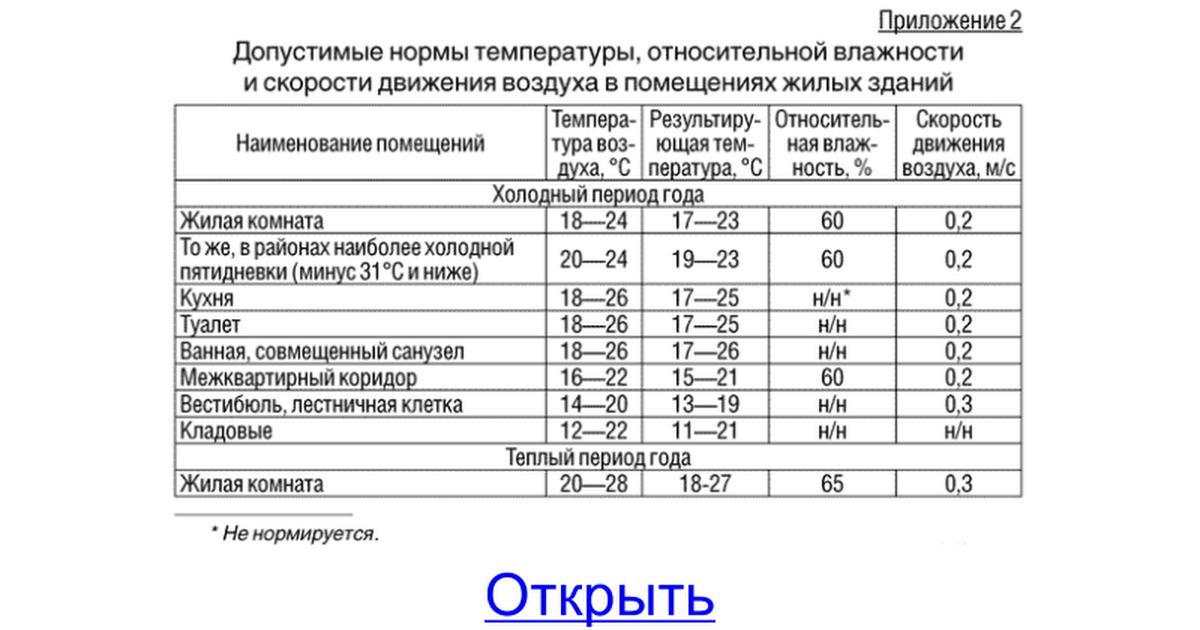Для детских дошкольных учреждений ГОСТ 30494–2011 определяет оптимальные нормы температуры от 18 до 22 °C в холодный период и 22–24 °C в теплый. Относительная влажность по нормативным таблицам зимой должна составлять 30–40%, а летом 30–60%.