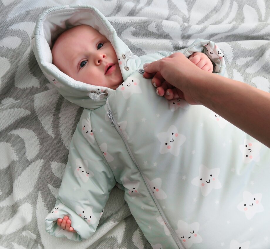 - Для детей от 3 до 6 месяцев выпускаются конверты с рукавами и капюшоном, которые дают малышу большую свободу движений для познания окружающего мира.