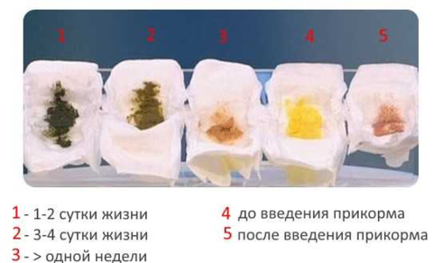 Π ΠΏΠ΅ΡΠ²ΡΠ΅ Π΄Π½ΠΈ ΠΏΠΎΡΠ»Π΅ ΡΠΎΠΆΠ΄Π΅Π½ΠΈΡ Ρ ΡΠ΅Π±Π΅Π½ΠΊΠ° ΠΎΡΡ ΠΎΠ΄ΠΈΡ ΠΌΠ΅ΠΊΠΎΠ½ΠΈΠΉ β ΠΏΠ΅ΡΠ²ΠΎΡΠΎΠ΄Π½ΡΠΉ ΠΊΠ°Π». ΠΠ½ ΠΌΠΎΠΆΠ΅Ρ Π±ΡΡΡ ΠΊΠΎΠ½ΡΠΈΡΡΠ΅Π½ΡΠΈΠΈ Π·Π°ΠΌΠ°Π·ΠΊΠΈ, ΡΠ΅ΡΠ½ΡΠΉ ΠΈΠ»ΠΈ ΡΠ΅ΠΌΠ½ΠΎ-ΠΊΠΎΡΠΈΡΠ½Π΅Π²ΡΠΉ, Π·Π΅Π»Π΅Π½ΠΎΠ²Π°ΡΡΠΉ ΠΈ ΠΏΠ»ΠΎΡ ΠΎ ΠΎΡΠΌΡΠ²Π°ΡΡΠΈΠΉΡΡ ΠΎΡ ΠΏΠ΅Π»Π΅Π½ΠΎΠΊ ΠΈ ΠΏΠΎΠΏΠΊΠΈ ΠΌΠ°Π»ΡΡΠ°. Π‘ Π½Π°ΡΠ°Π»ΠΎΠΌ ΠΏΠΈΡΠ°Π½ΠΈΡ ΠΌΠΎΠ»ΠΎΠΊΠΎΠΌ ΠΈΠ»ΠΈ ΡΠΌΠ΅ΡΡΡ ΡΡΡΠ» ΡΡΠ°Π½ΠΎΠ²ΠΈΡΡΡ ΠΆΠΈΠ΄ΠΊΠΈΠΌ, Π½Π΅ΠΎΠ΄Π½ΠΎΡΠΎΠ΄Π½ΡΠΌ, Ρ Π±Π΅Π»ΡΠΌΠΈ ΠΊΠΎΠΌΠΎΡΠΊΠ°ΠΌΠΈ. ΠΠ°ΠΏΠ°Ρ ΡΡΡΠ»Π° Ρ Π³ΡΡΠ΄Π½ΠΈΡΠΊΠΎΠ² ΠΊΠΈΡΠ»ΡΠΉ, Ρ ΠΈΡΠΊΡΡΡΡΠ²Π΅Π½Π½ΠΈΠΊΠΎΠ² β ΠΊΠ°Π»ΠΎΠ²ΡΠΉ, ΠΌΠΎΠΆΠ΅Ρ Π±ΡΡΡ Π΄ΠΎΠ²ΠΎΠ»ΡΠ½ΠΎ Π½Π΅ΠΏΡΠΈΡΡΠ½ΡΠΌ.