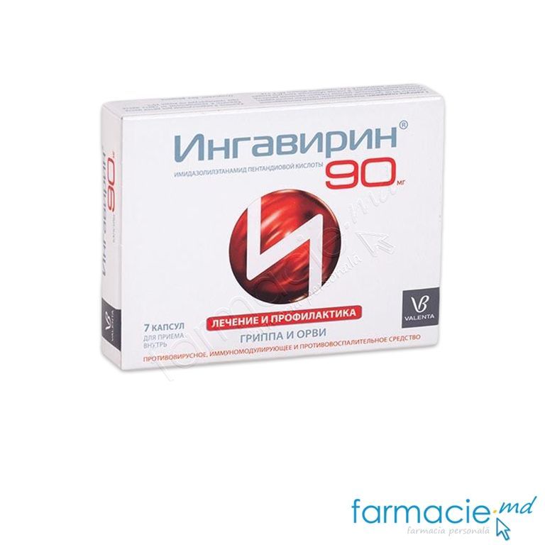 Бентук продуктИнгавирин агент антивирус болех дидапати далам бентук капсул биру атау мерах, янь менгандунги сербук путих дан сербук. Таблетка 30 мг (биру) дан 90 мг (мерах) ян дикелуаркан пада 7 кепин далам лепух, 1 лепух ди далам котак кадбод. Kesan farmakologiMempunyai anti-radang, иммуномодулирующее дан тиндакан противовирусный. Фармакодинамик дан ФармакокинетикUbat pertama mempunyai kesan противовирусное.Ia bertindak вирус терхадап грипп jenis A, . Парагрипп . аденовирус дан jangkitan pernafasan senitsialnoy . Kesan anti-radang adalah dengan menghalang pengeluaran radang Цитокин дан менгурангкан активити миелопероксидаза . Денган сакит текак . Дада Ини Денган Чепат Дари Салуран Пенсернаан Ке Далам Алиран Дарах, Дан Джуга Дягихкан Кепада Орган. Селепас 30 минут селепас дителан кепекатан максимум дииперхатикан далам орган-орган дан дарах.Далам бадан, иа тидак диметаболисмакан, дипапаркан далам бентук ян сама. Кебаньякан (кира-кира 80%) дарипада убат иту дикелуаркан дари бадан далам маса беберапа хари. 77% daripada ubat dikumuhkan melalui usus, bahagian selebihnya — melalui buah pinggang. ПетунюкИнгавирин убат противовирусный дитетапкан далам хал ян берикут: