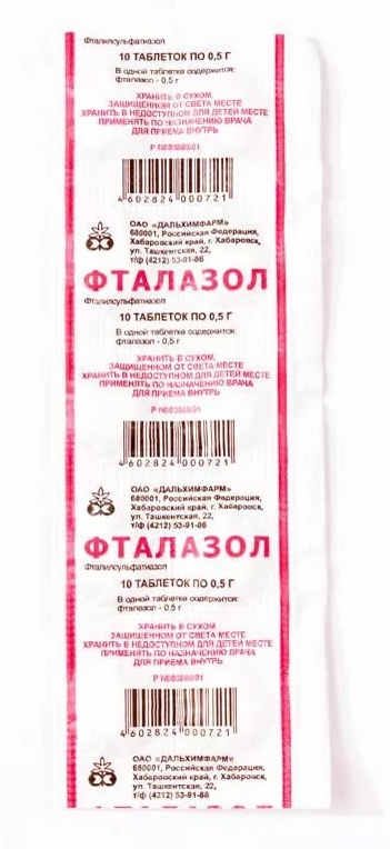 Фталазол — это однокомпонентный таблетированный препарат для употребления внутрь, при этом в состав каждой таблетки входит 500 мг действующего вещества — фталилсульфатиазола (инструкция МЗ Украины).