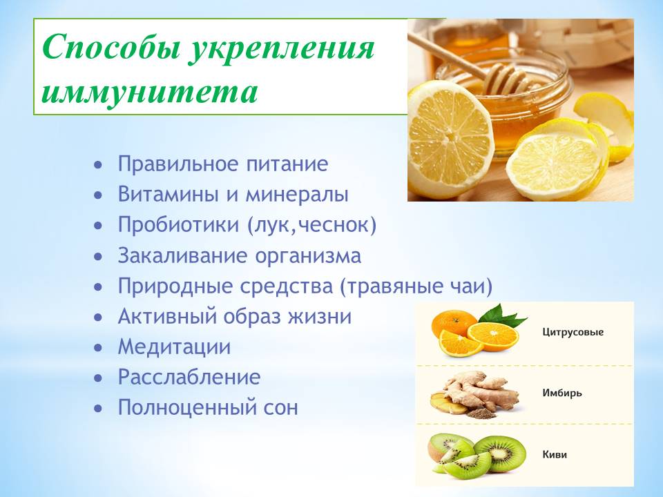 10 способов укрепить иммунную систему: 1. Добавки: Можно принимать в профилактических целях для укрепления иммунной системы или в качестве лечения, если вы заболели.- Витамин D3 — Витамин D быстро разрушает клеточные стенки бактерий, грибков и вирусов, включая вирус гриппа. Получение как можно большего количества солнечного света на вашей коже также укрепит иммунную систему!
