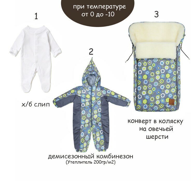 По мере понижения температуры можно одевать новорожденного в теплые трикотажные комбинезоны, плотную шапочку и шарф. При необходимости используют демисезонный конверт или комбинезон. Далее в комплект следует добавить варежки, теплые носки или пинетки, теплый зимний комбинезон или одеяло. При температуре ниже -10 выходить с новорожденным на прогулки не рекомендуется.