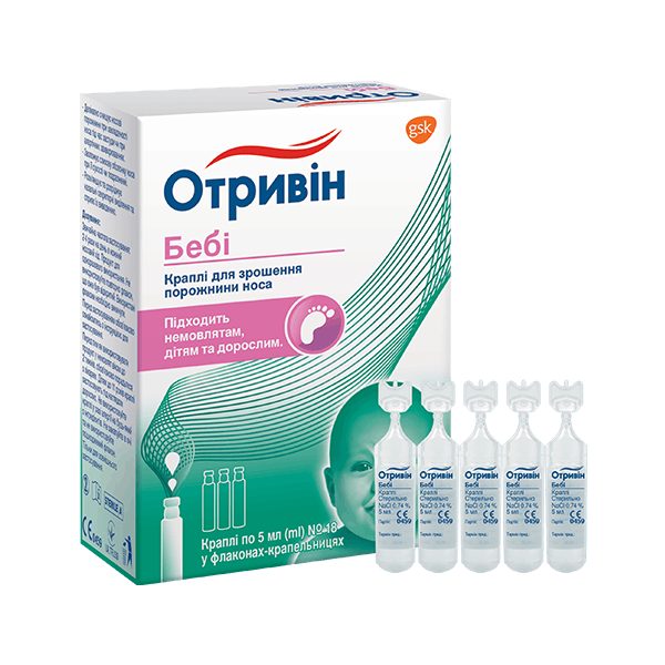 Отривин Бэби капли для орошения полости носа в одноразовых флаконах-капельницах – создан для ухода за полостью носа младенцев и детей до 1 года и старше, для увлажнения и очищения слизистой оболочки носа. Это стерильный изотонический раствор натрия хлорида, уровень pH которого близок естественной секреторной жидкости слизистой носа.