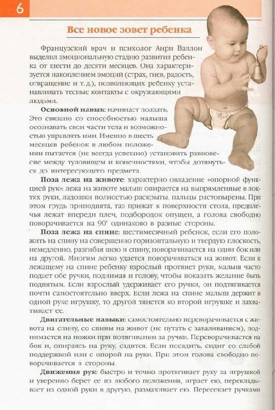 6-й месяц приносит крохе дальнейшую свободу действий. Он дотягивается до игрушки из любого положения. Может держать в каждой руке по игрушке, следит за упавшей игрушкой, поднимает ее, подносит удерживаемый предмет ко рту. Переворачивается с живота на спину. В положении на животе может опираться на одну руку и перемещать все тело с одной руки на другую. При вертикализации хорошо опирается на ноги. Посаженный удерживает позу с опорой на две руки. Некоторые дети, особенно находящиеся много времени на животе, перед тем как научиться садиться, начинают ползать на животе, передвигаясь с помощью рук вокруг своей оси, потом назад и немного позже вперед.