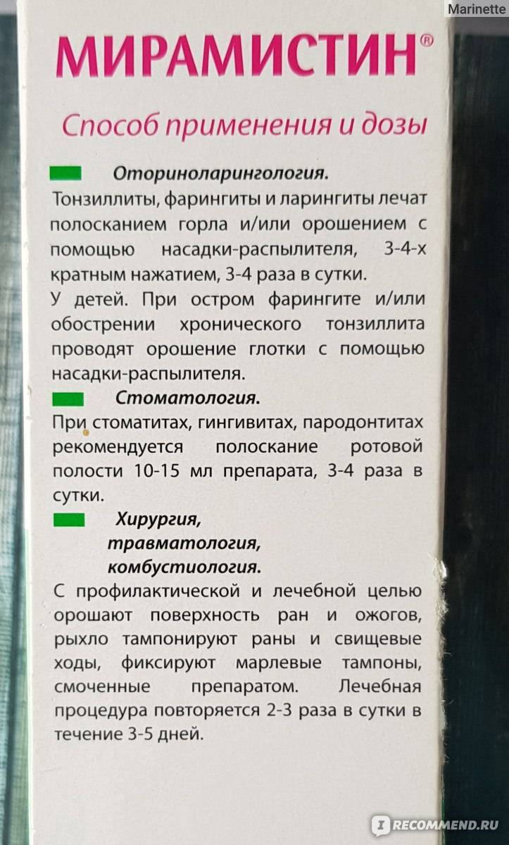 | ТонзиллитФарингитЛарингит | Орошение Мирамистином-спреем или полоскание горла 10—15 мл раствора, повторять 3—4 раза в сутки | 4—10 дней |