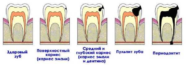 - кариес – разрушение твердых тканей зуба, имеющее инфекционную этиологию. При отсутствии своевременного лечения полость увеличивается в размере;
