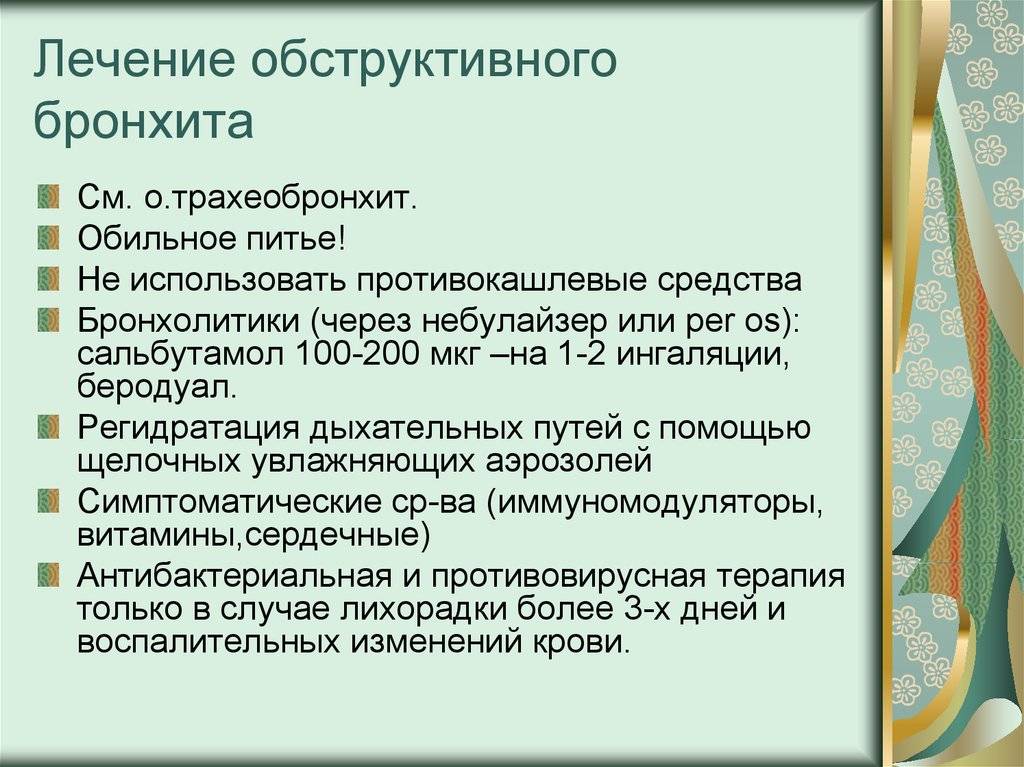 Бронхит без повышения температуры у ребенка требует комплексного лечения, которое включает в себя: