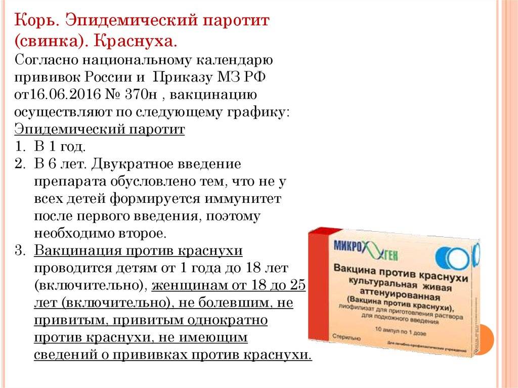 Согласно Национальному календарю профилактических прививок, курс первичной иммунизации состоит из 1 дозы вакцинации в возрасте 12 месяцев и вакцинации в возрасте 6 лет.