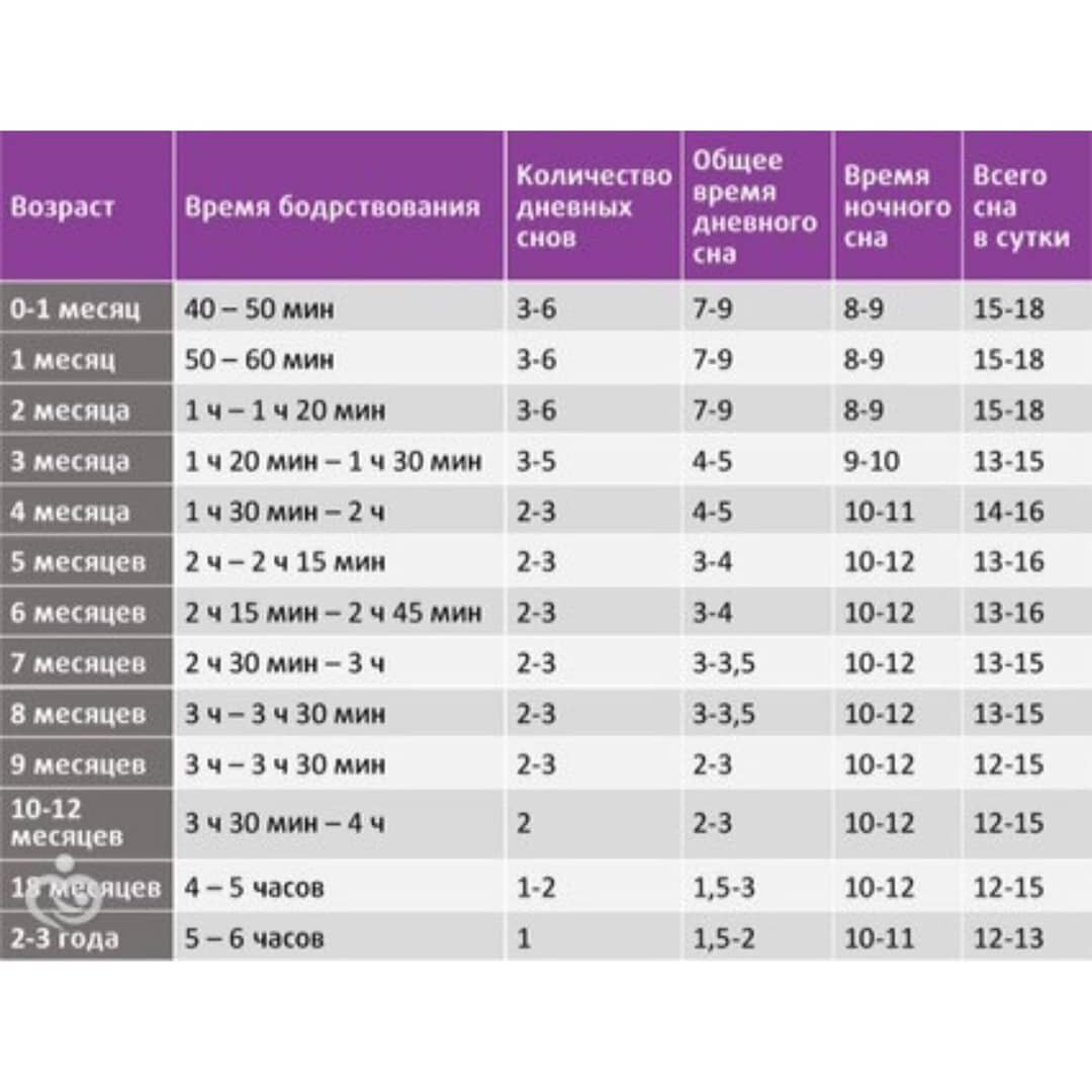 - Длительность ночного сна: 10-12 часов без пробуждений