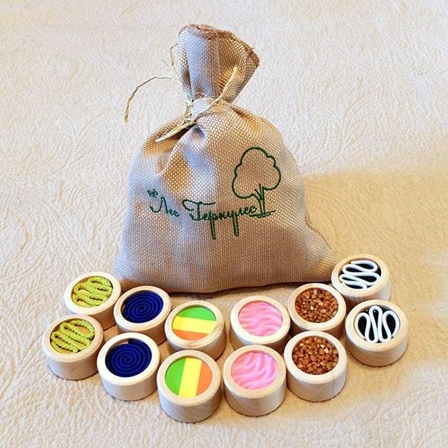 1. Для начала изучите с ребенком все бочонки с материалом, прощупайте, найдите одинаковые.