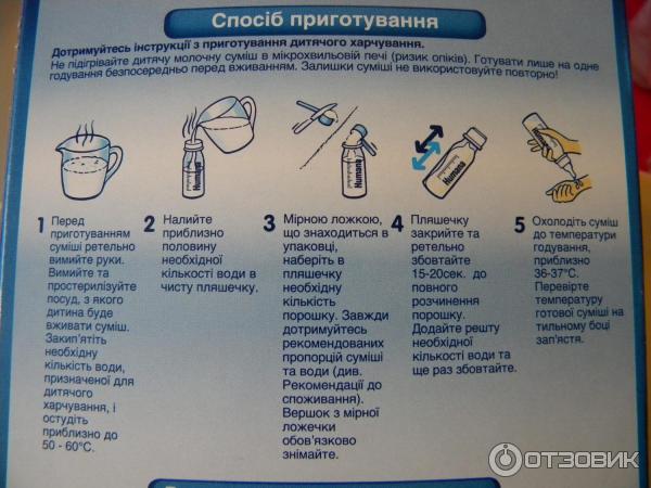 Коли підходить час годування, у пляшечку із сухим порошком додають кип’ячену воду та готують.