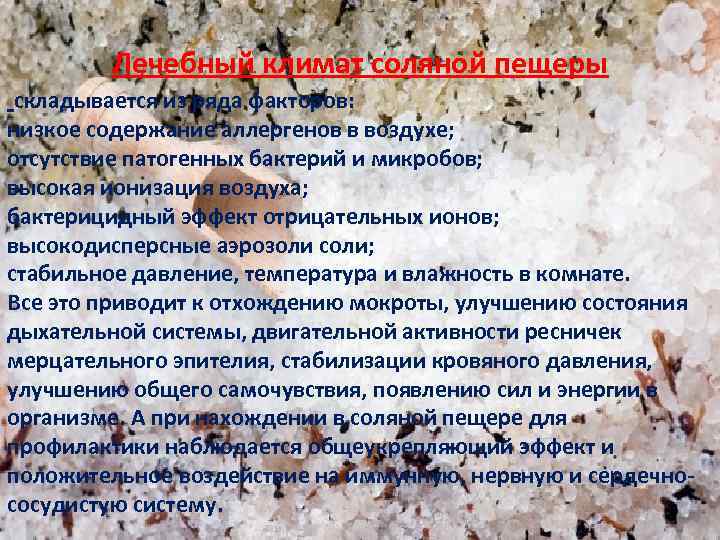 Основной компонент, оказывающий оздоровительное воздействие на организм – сухой солевой аэрозоль определенной концентрации. Благодаря контролируемому размеру респирабельных частиц соли, происходит их глубокое проникновение в самые отдаленные отделы дыхательных путей. Здесь отрицательно заряженные солевые частицы оказывают активное муколитическое действие, что ведет к активизации дренажной функции бронхов и лёгких, облегчению отделения мокроты.