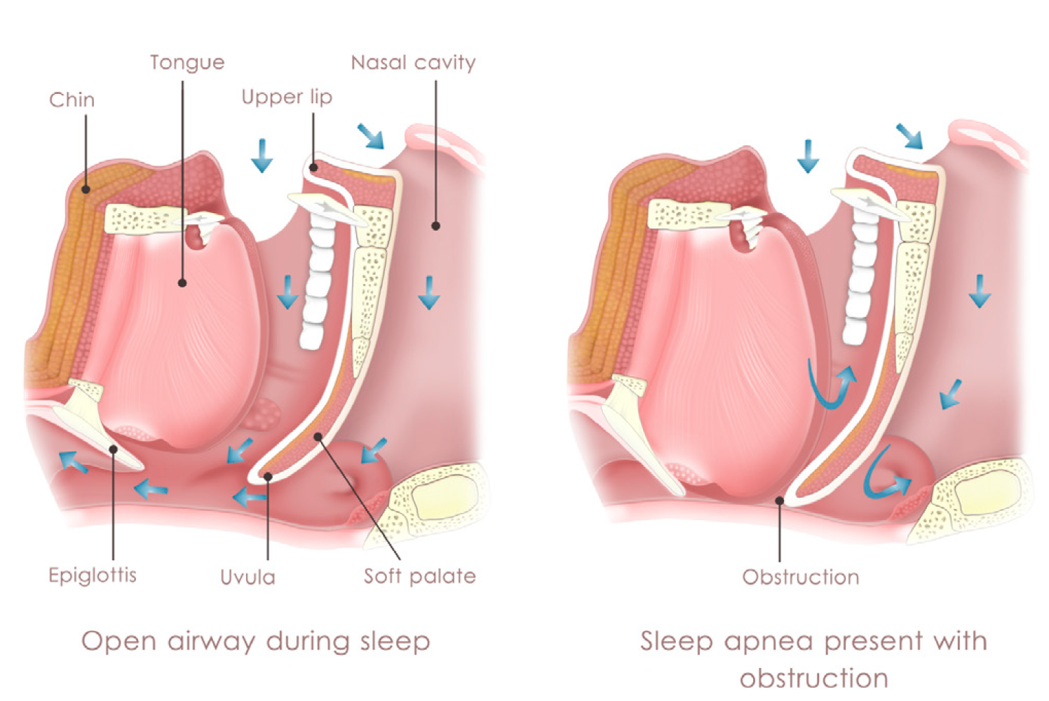 Прежде чем разобраться с сонным апноэ, нужно понять, как вообще работает дыхание. Когда вы бодрствуете, мышцы горла держат дыхательные пути прямыми и открытыми, чтобы воздух мог поступать и выходить из легких. Когда вы спите, эти мышцы расслабляются, а горло сужается. Обычно это не закрывает дыхательные пути, а просто замедляет дыхание во время сна.